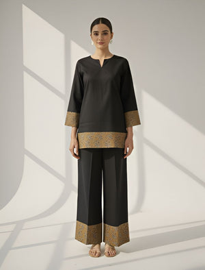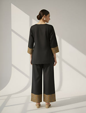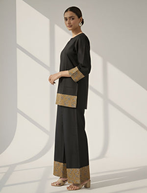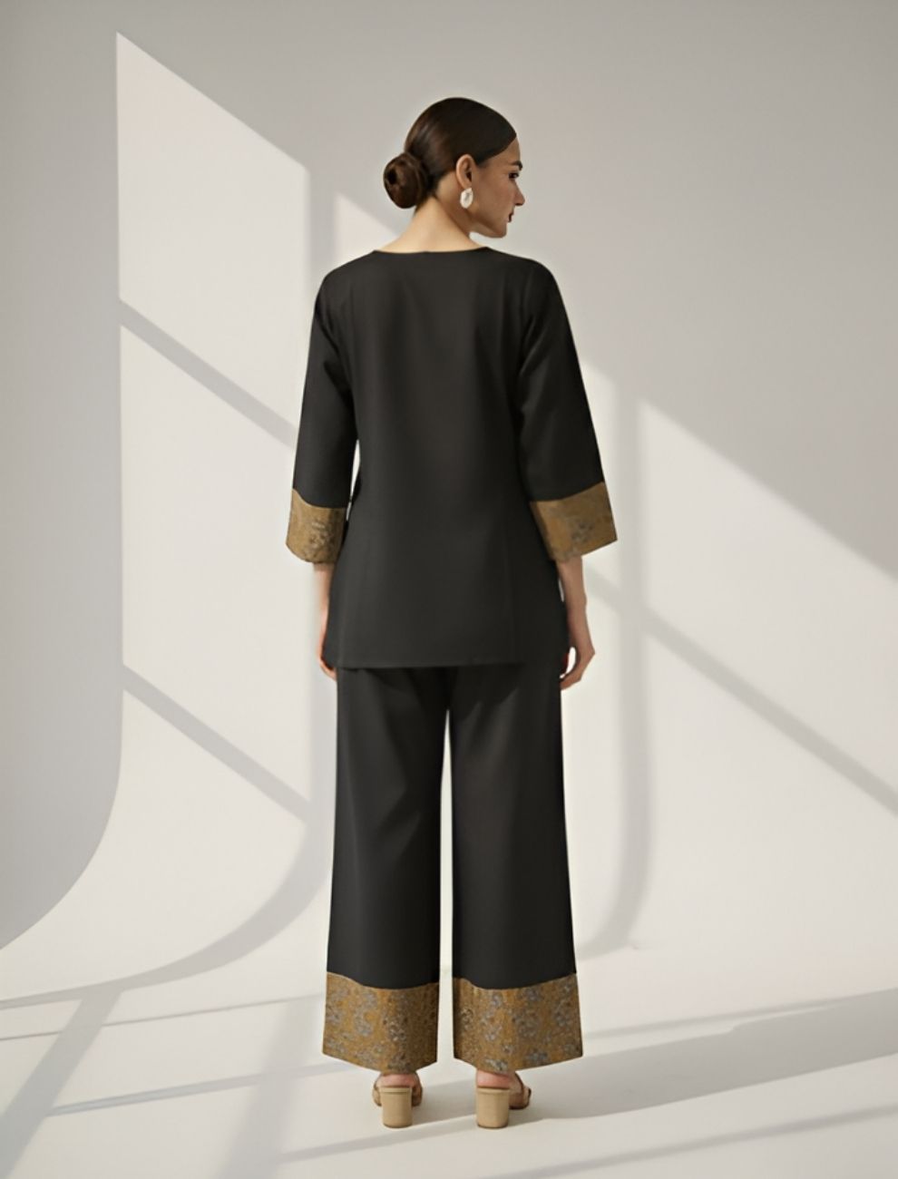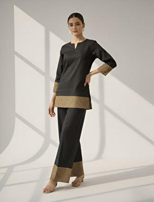This Black & Antique Gold Cotton Kurta Set from Unifringe redefines contemporary ethnic elegance. The kurta is tailored from luxurious soft cotton, featuring a sleek notched neckline and three-quarter sleeves accentuated with antique gold floral borders. Paired with wide-leg black pants adorned with matching gold print at the hem, this ensemble radiates quiet confidence and timeless charm.
