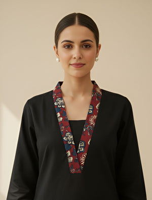 Black & Maroon Cotton Kurta Set with Screen-Printed Design