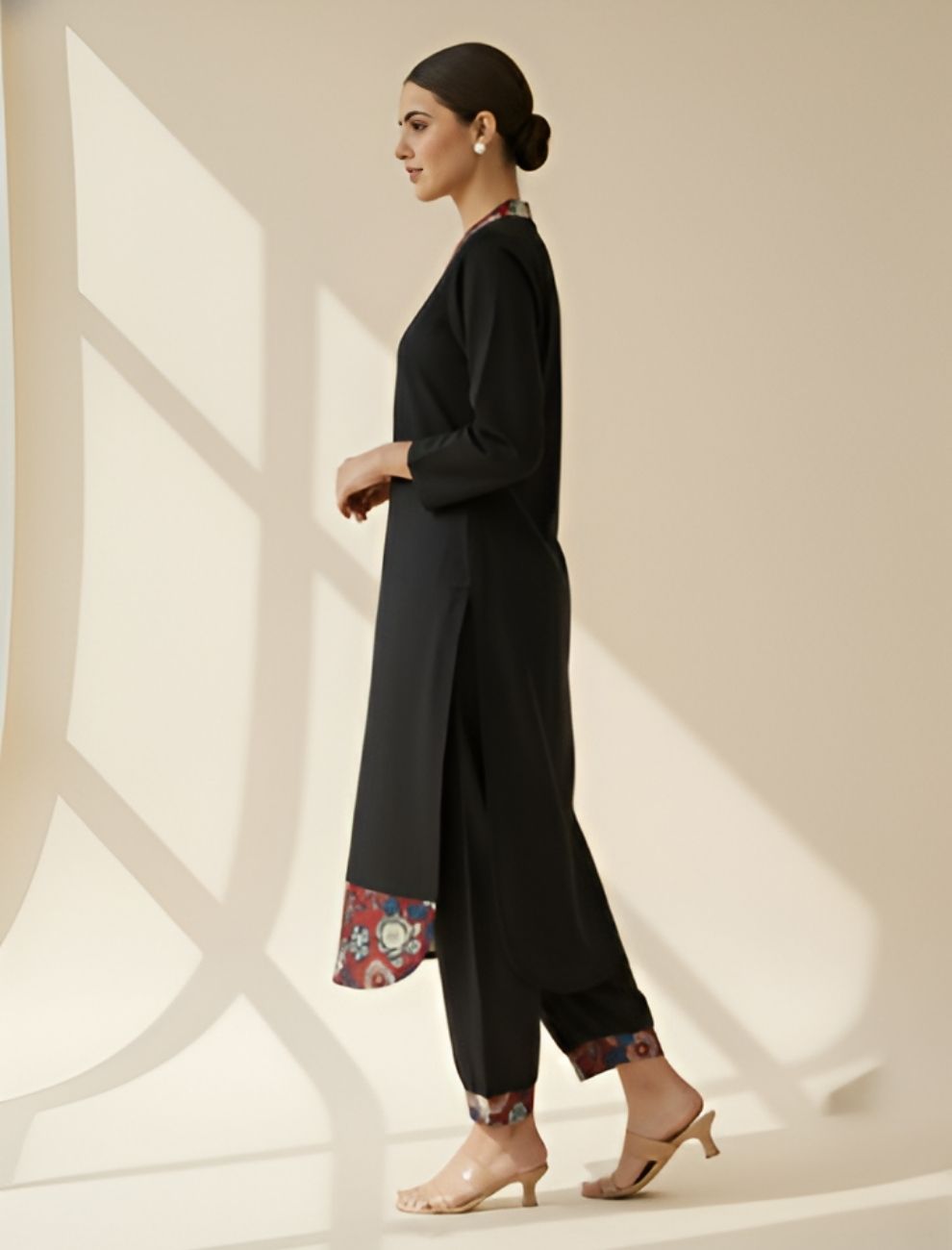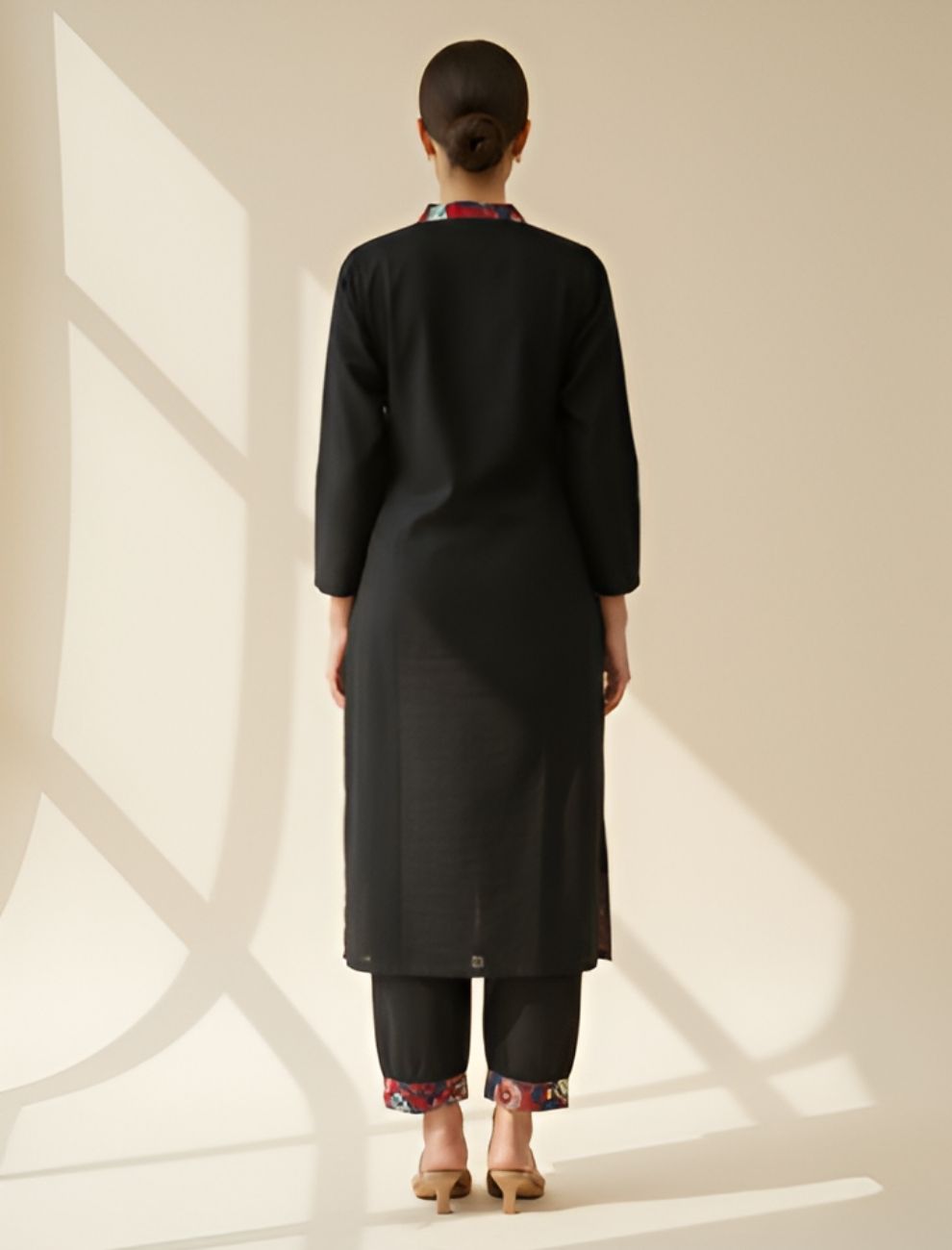 Made from soft, breathable cotton, the kurta features a deep maroon printed neckline and floral screen-printed border, paired with straight pants detailed with matching printed cuffs. The design harmonizes contemporary minimalism with a hint of traditional grace, ideal for both workwear elegance and understated festive dressing.