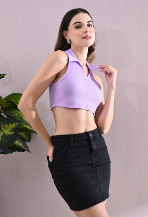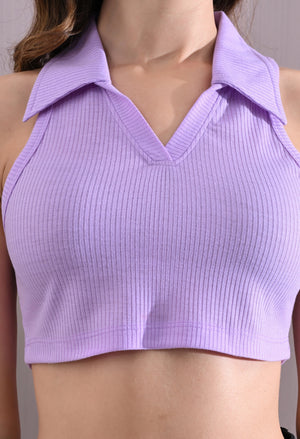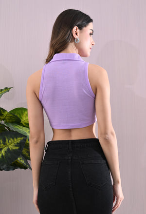 Elevate your casual wardrobe with the Unifringe Collar Neck Sleeveless Ribbed Knit Crop Top. Designed for comfort and style, this lavender fitted crop top features a sleek collar neck and a sleeveless silhouette that effortlessly blends modern trends with timeless elegance. Crafted from high-quality knitted polycotton, it offers a soft, breathable feel, perfect for all-day wear. Pair it with high-waisted jeans or a skirt for a chic, laid-back look suitable for any casual outing.