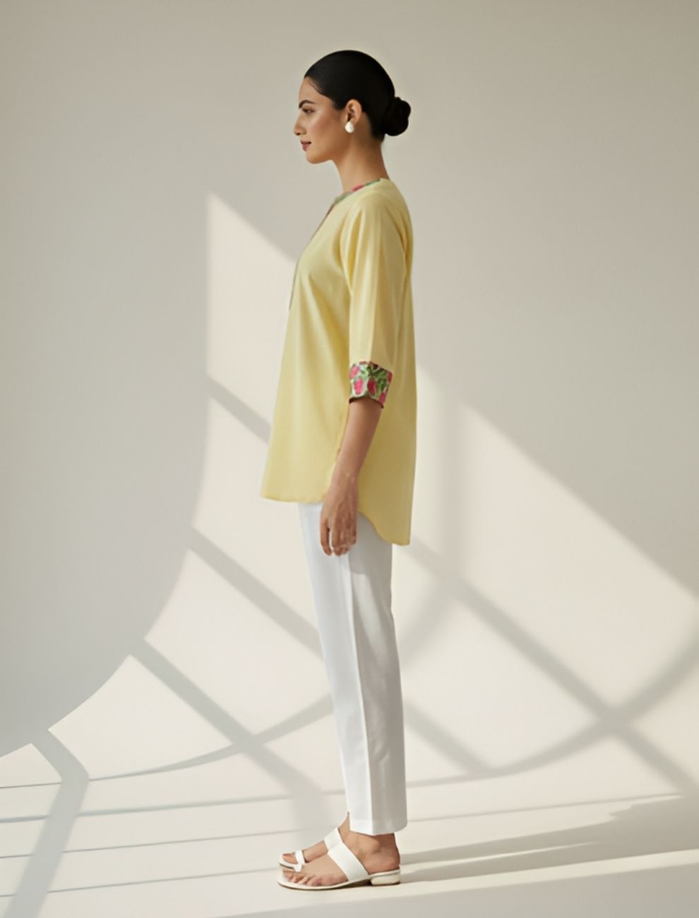 Bright, airy, and effortlessly graceful — this Yellow Cotton Flex Kurti from Indiraara captures the joy of simplicity through conscious design.
