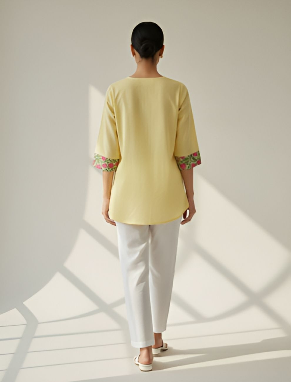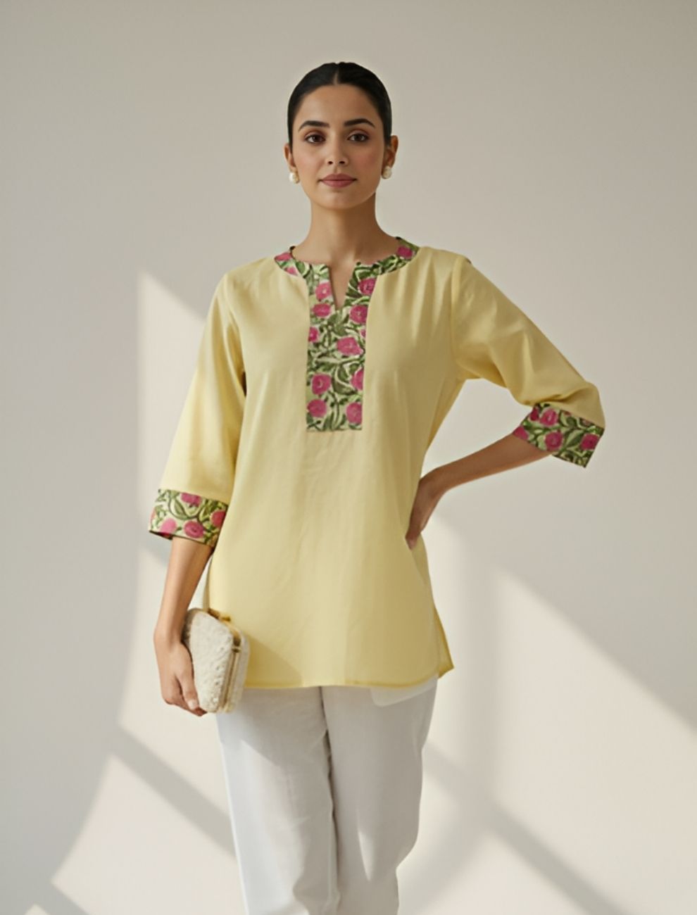 Made from premium cotton flex, the kurti offers natural breathability and texture for everyday comfort. The neckline and sleeve patches are adorned with hand block-inspired floral prints in hues of pink and green, creating a refreshing contrast against the warm yellow base. Its front-short and back-long silhouette brings a contemporary edge, balancing traditional charm with modern structure.