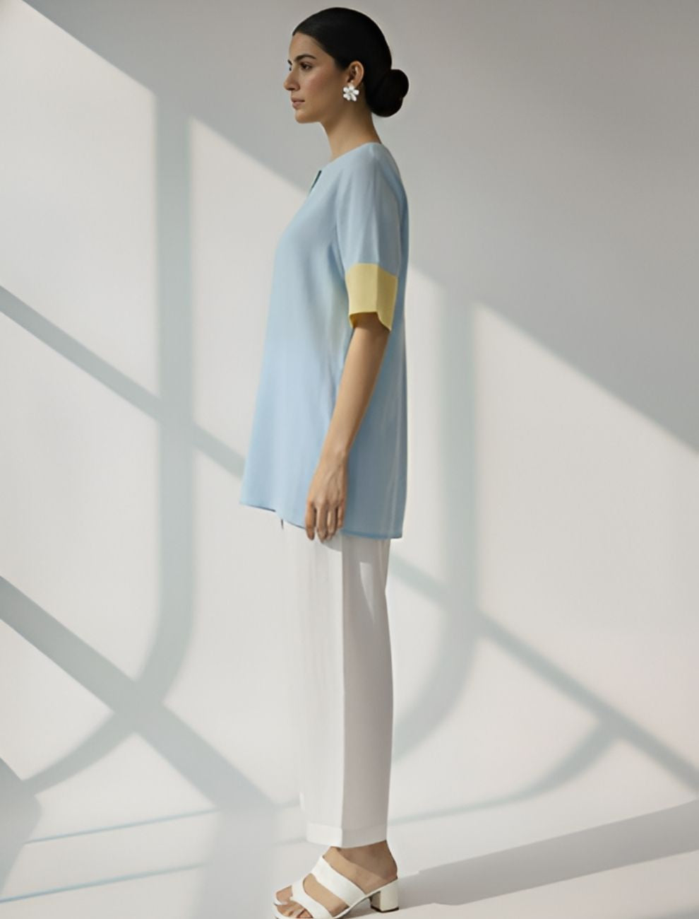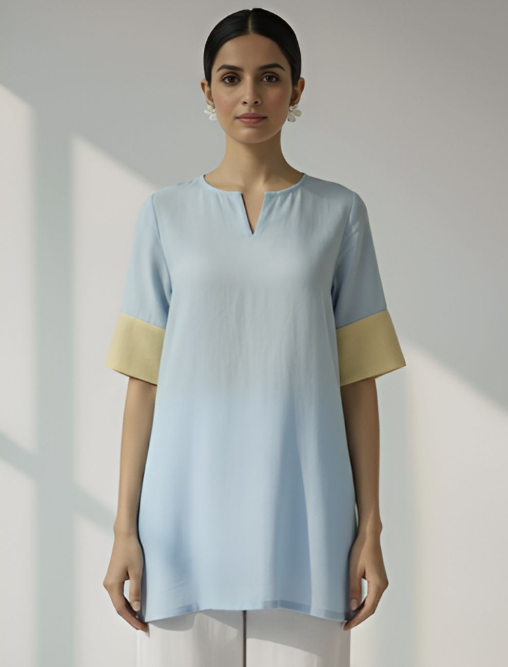 Crafted in premium Cotton Flex fabric, the kurti offers breathability and structure while remaining lightweight and gentle on the skin. The soft sky-blue body evokes serenity, while the contrasting lemon-yellow cuffs add a hint of cheerful vibrance. The subtle notch neckline and clean straight fit make it an ideal pick for relaxed workwear, travel, or brunch styling.