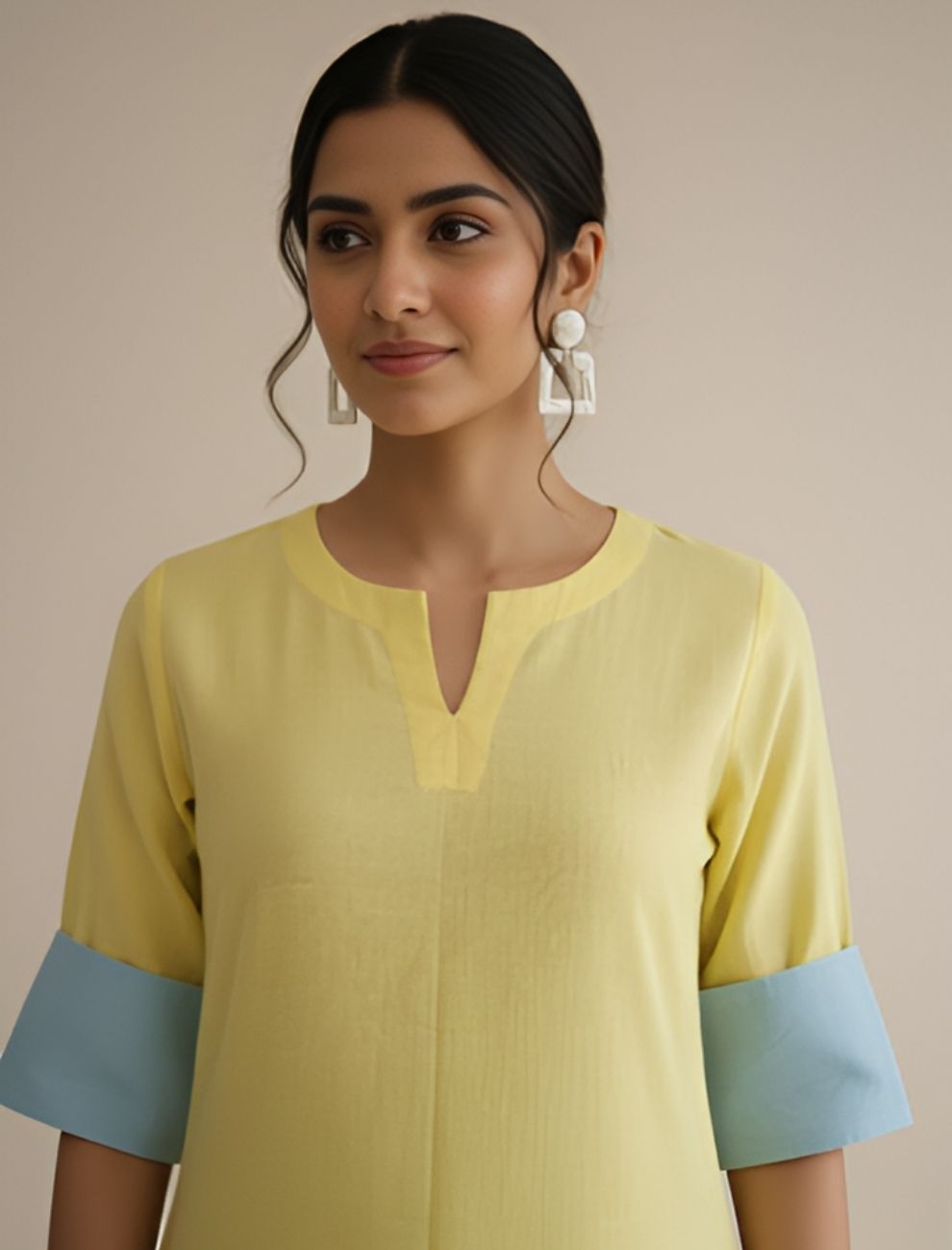 The kurta is tailored in a soft lemon yellow hue with sky-blue contrast cuffs, featuring a notched neckline and straight silhouette for timeless appeal. Complemented with relaxed-fit sky-blue cotton pants, this set exudes a modern yet soothing charm — perfect for warm days, travel, or serene gatherings.