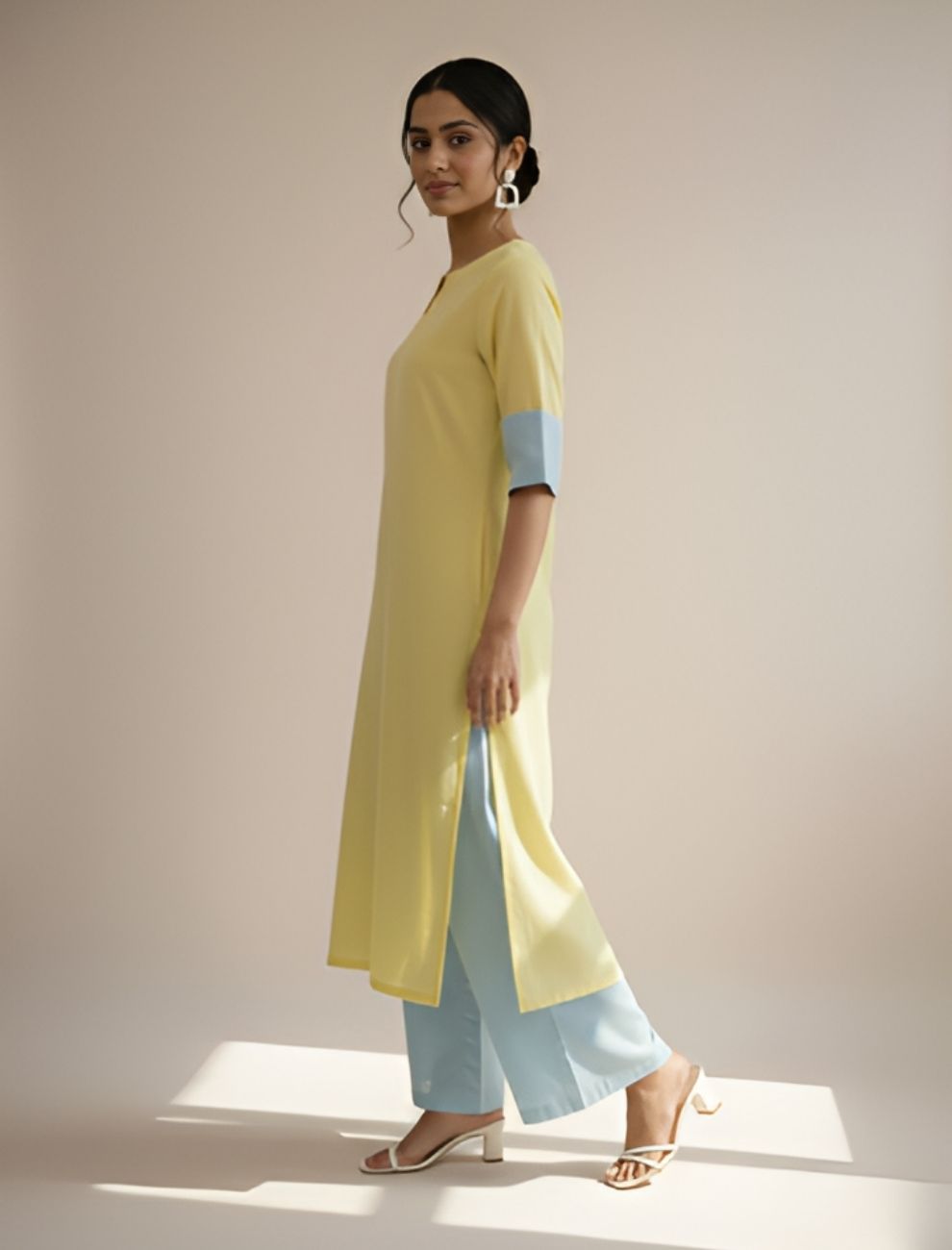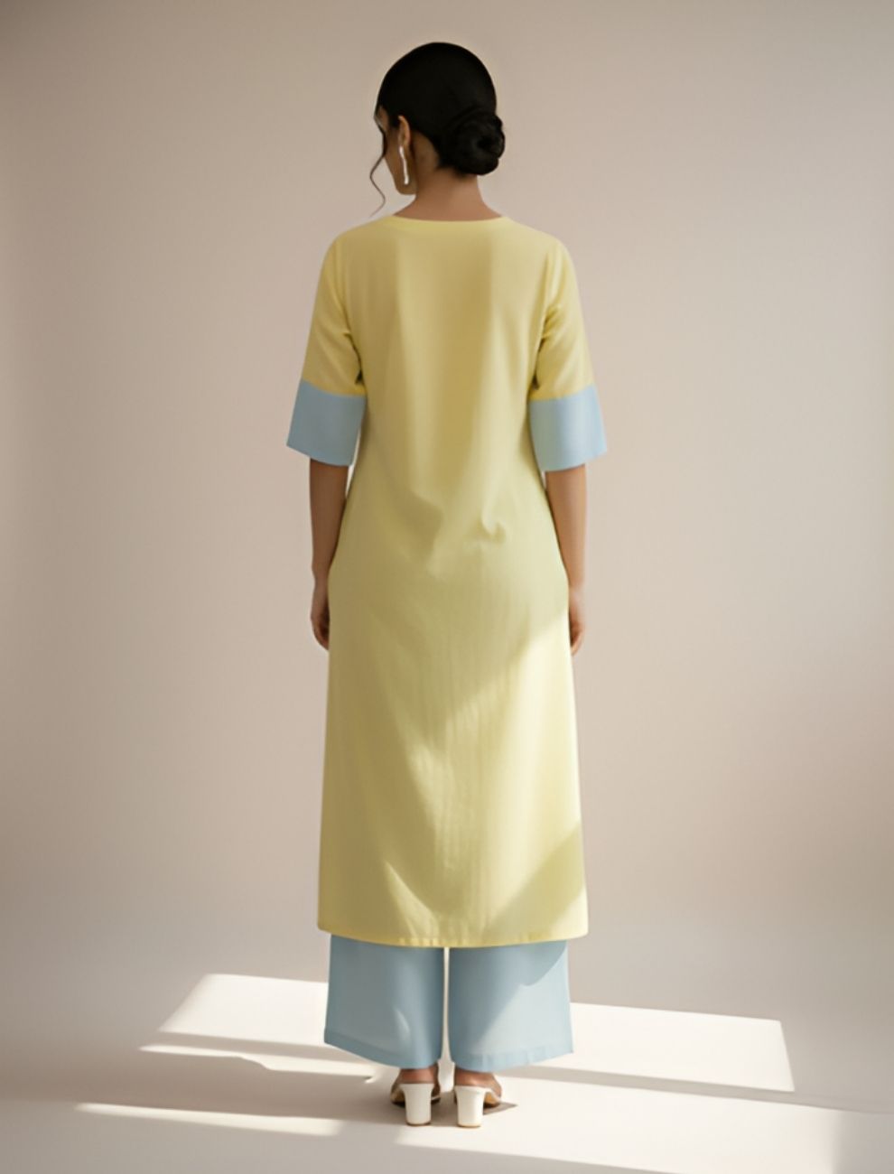 Lemon Yellow & Sky Blue Cotton Kurta Set with Elegant Design