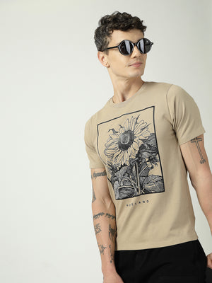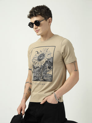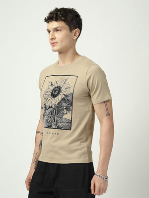 Men’s Beige Graphic T-Shirt | Homeland Sunflower Print | 100% Cotton Casual T-Shirt for Men