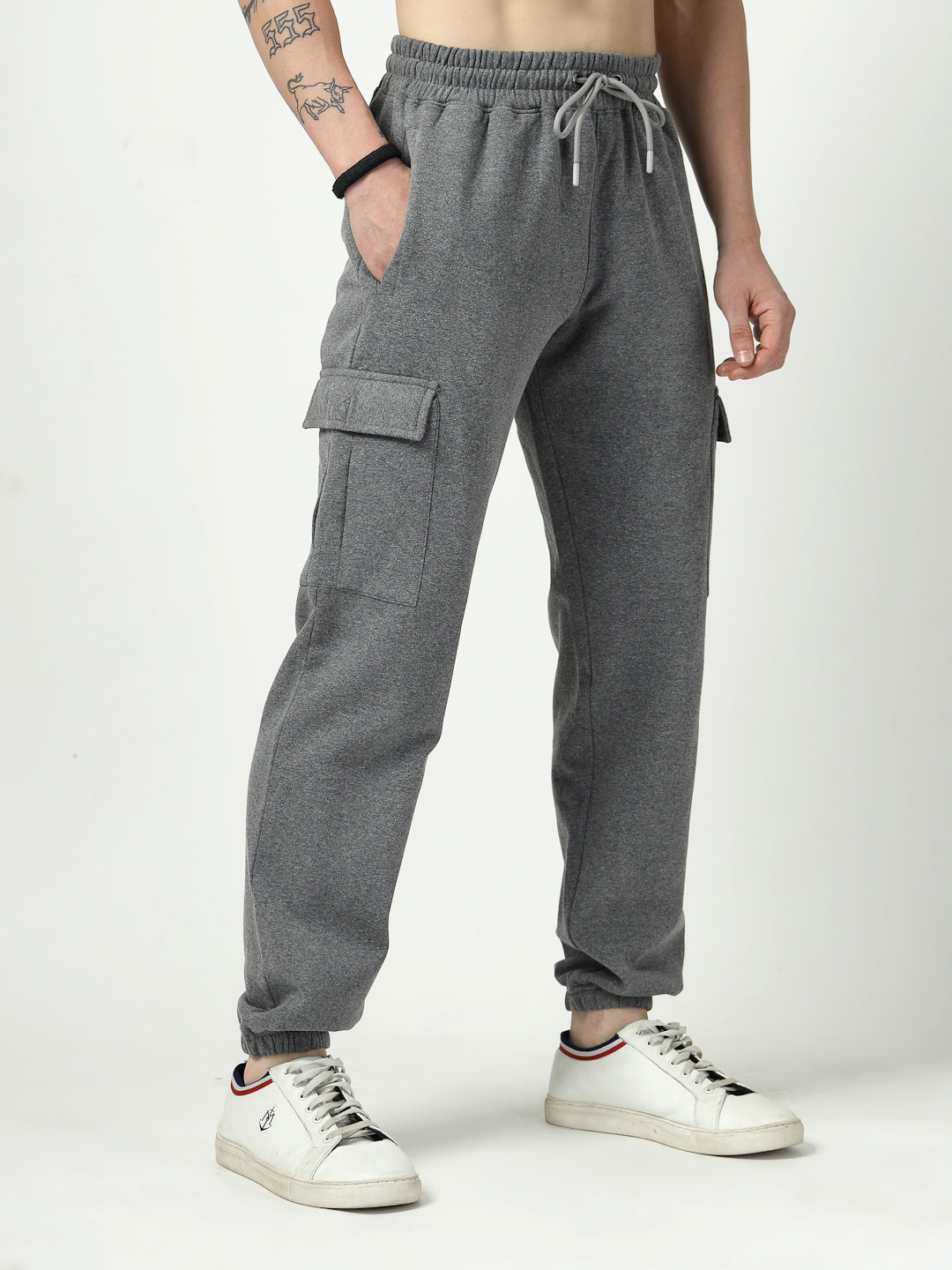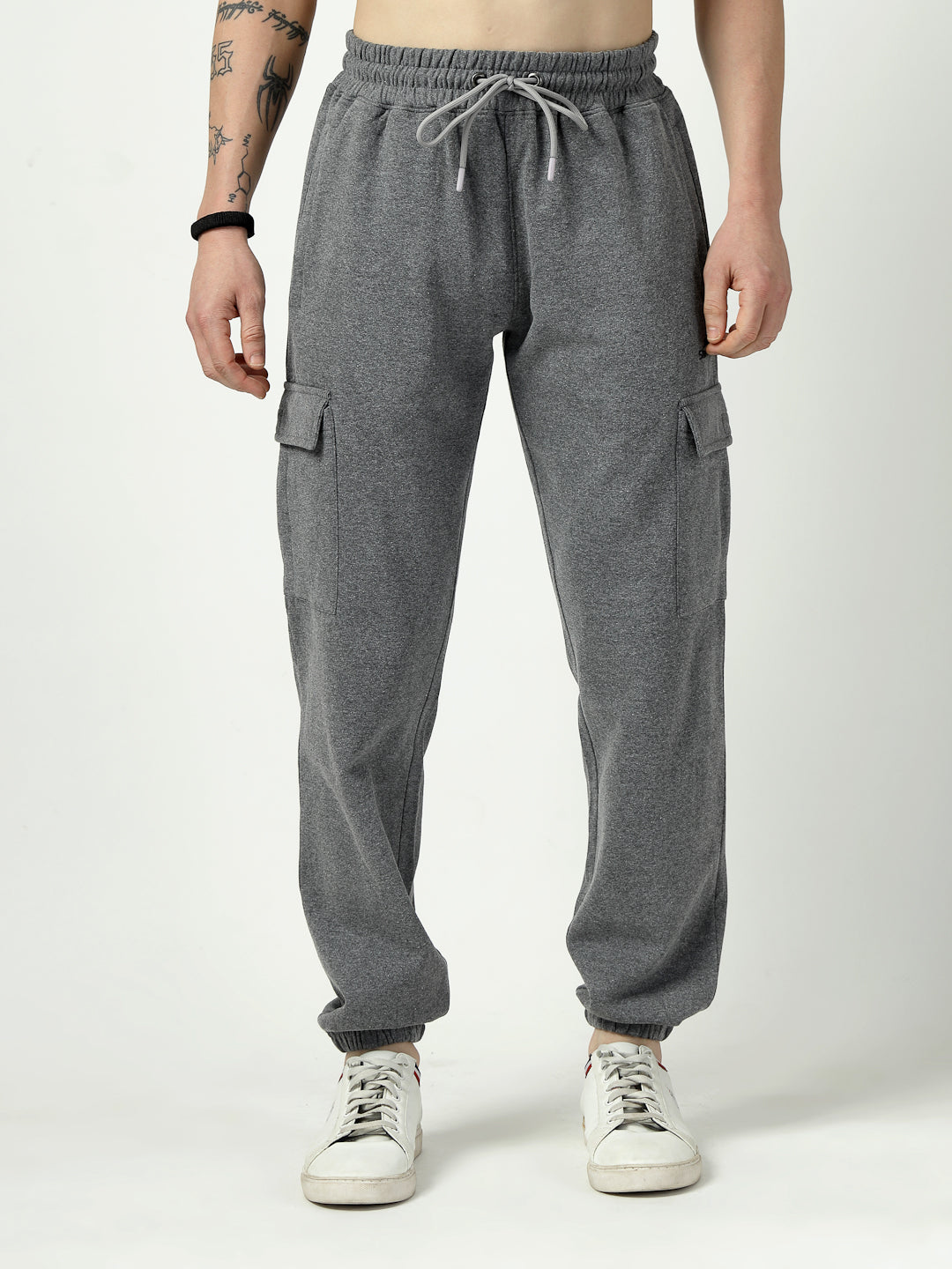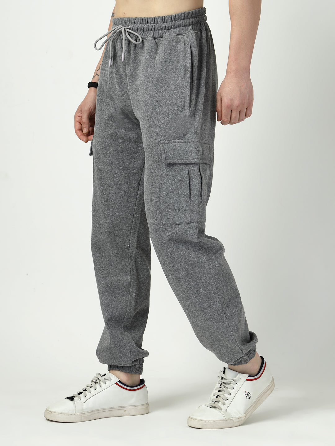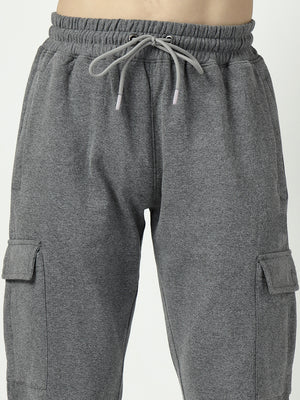 Comfort meets functionality with these charcoal grey fleece joggers, designed with utility cargo pockets for a modern streetwear look.