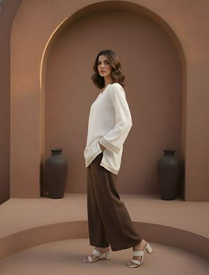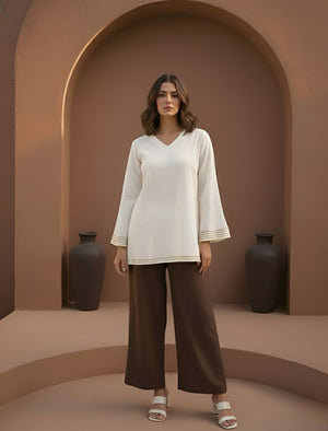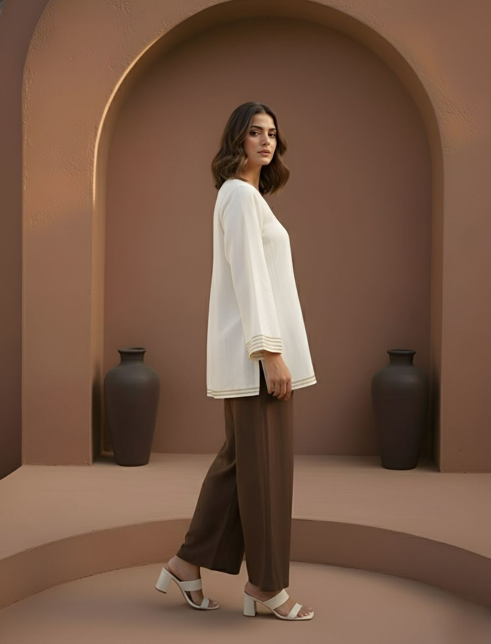 Made from premium Cotton Flex fabric, it offers breathability, structure, and day-long comfort, making it perfect for both formal and casual wear. The delicate golden thread detailing on the cuffs and hemline adds a hint of luxury to its clean silhouette, while the V-neckline and flared sleeves lend a contemporary touch.