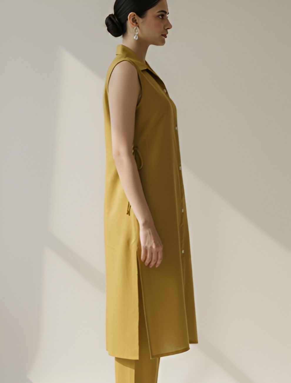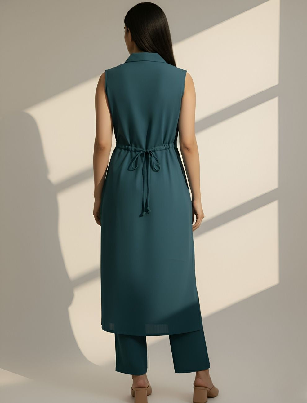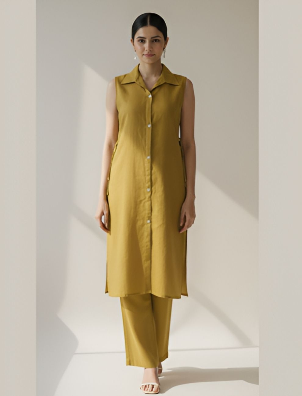 Pattern: Sleeveless collared kurta with button-down detailing ,Straight-cut trousers offering structured comfort