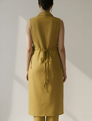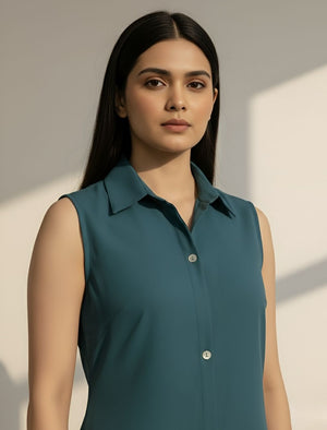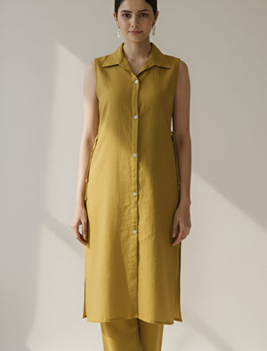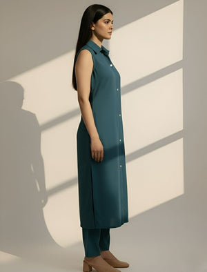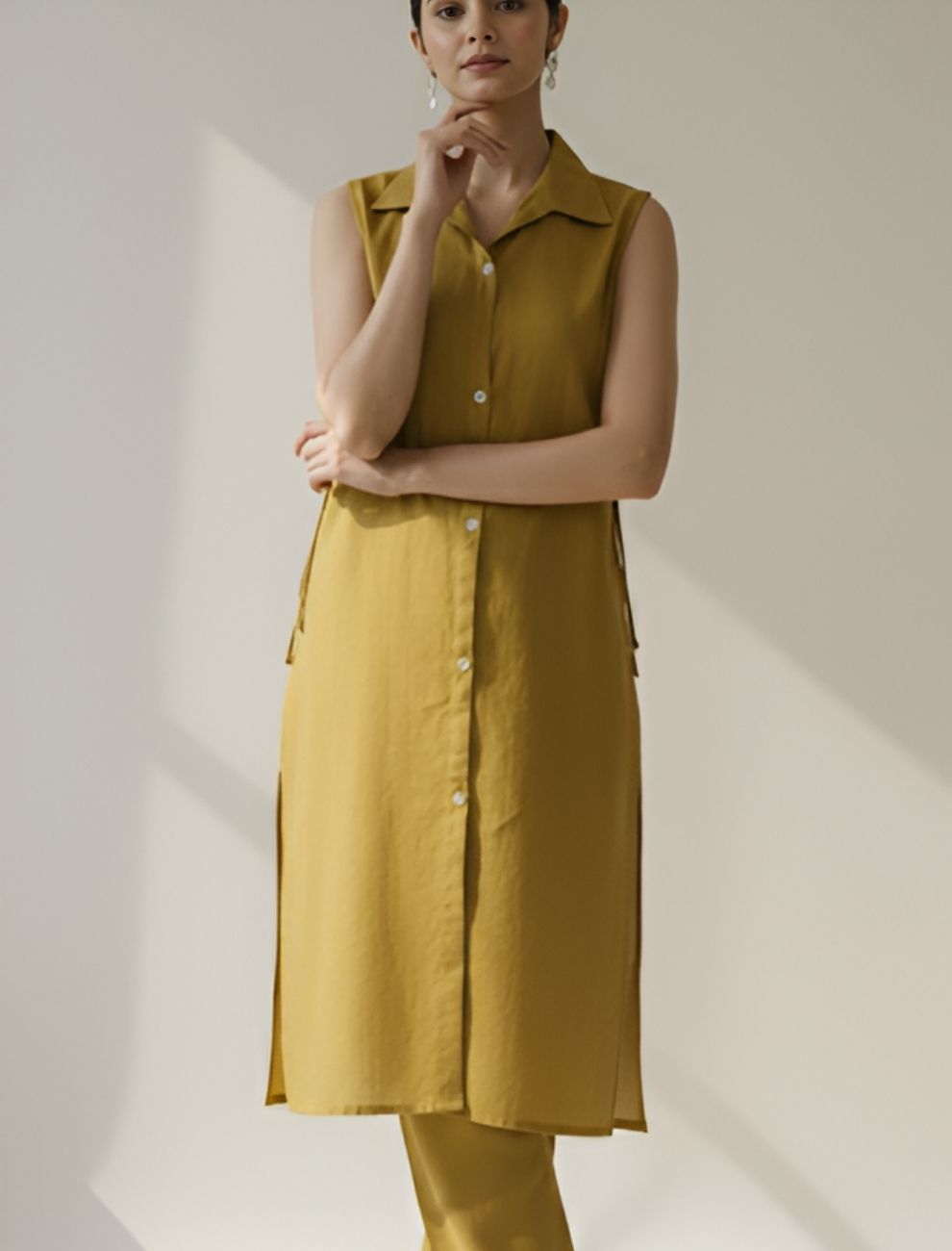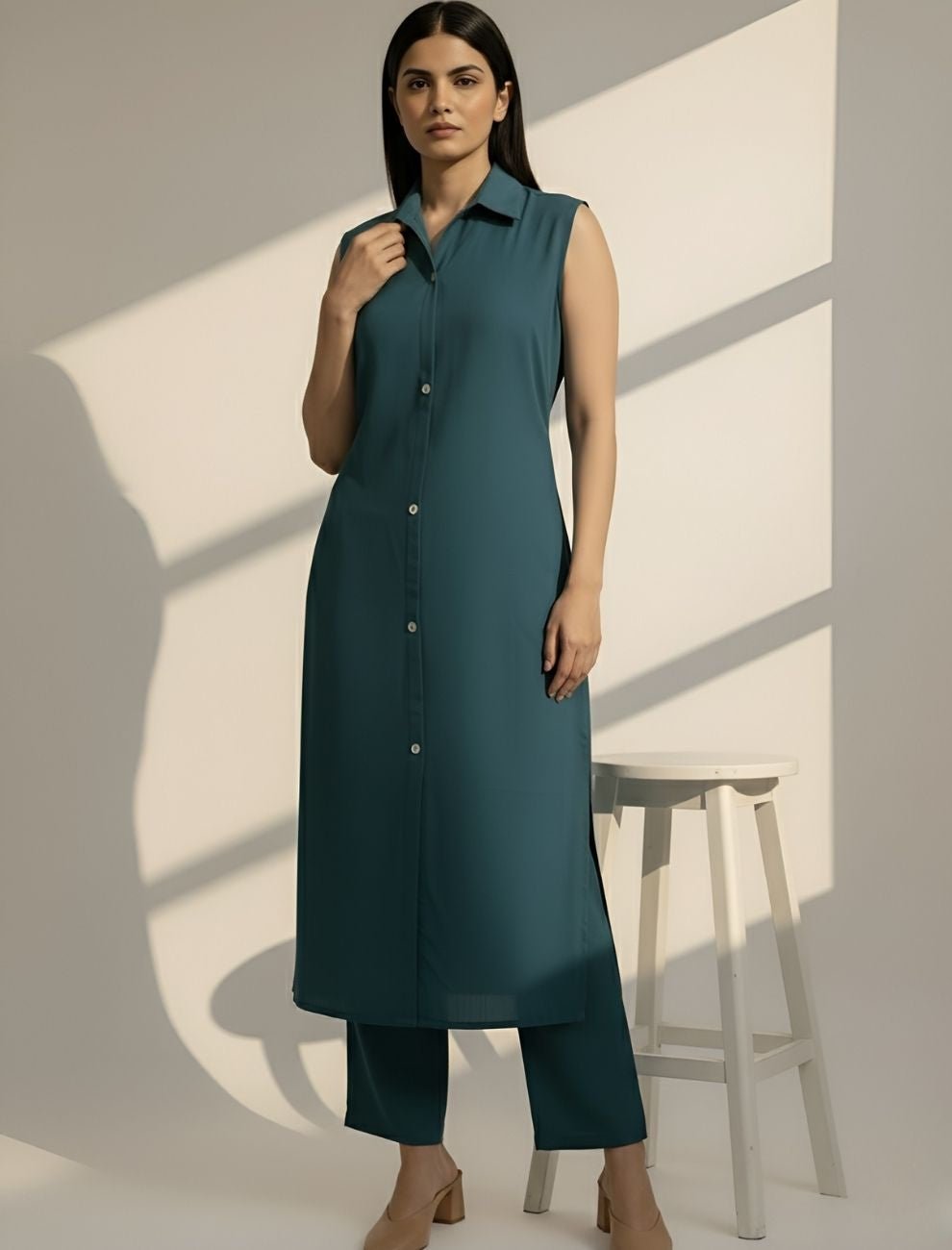 Pattern: Sleeveless collared kurta with button-down detailing ,Straight-cut trousers offering structured comfort