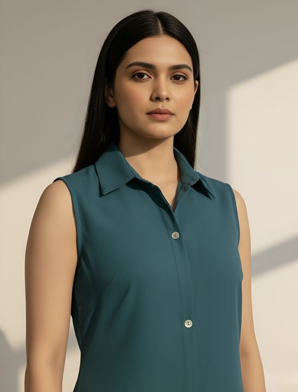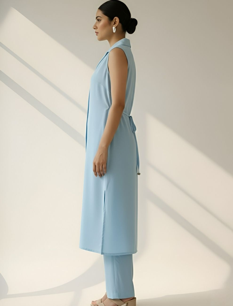 Soothing, structured, and effortlessly elegant — this Sky Blue Sleeveless Cotton Flex Kurta Set from Indiraara captures the spirit of serene summer minimalism.