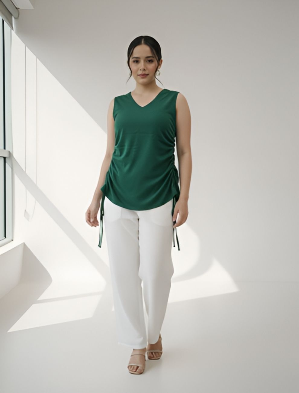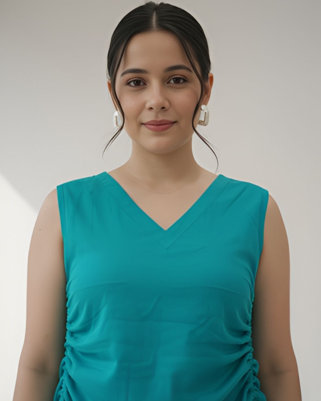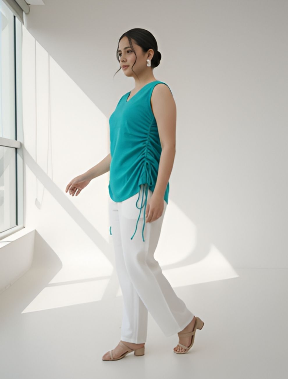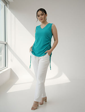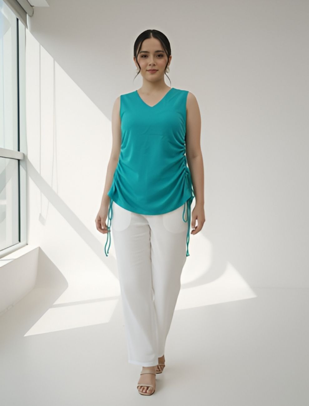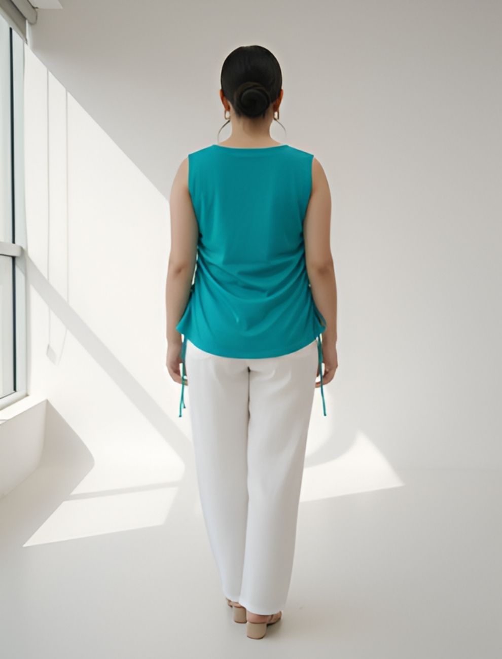 The V-neck design enhances the neckline gracefully, while the side drawstring detailing lets you adjust the shape to flatter your silhouette. The sleeveless cut adds a modern touch, ideal for warm days or layered styling. The vibrant teal blue hue reflects calm confidence — perfect for women who appreciate effortless sophistication.