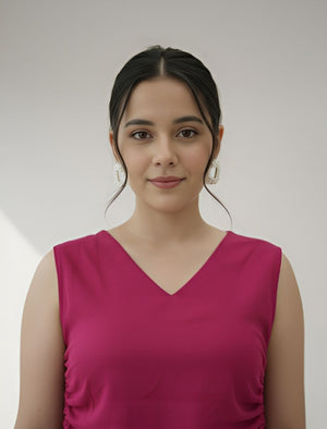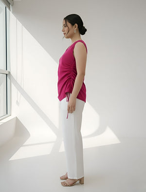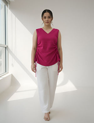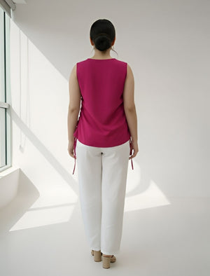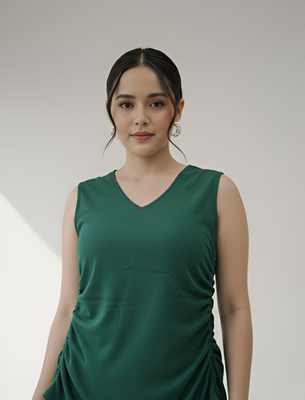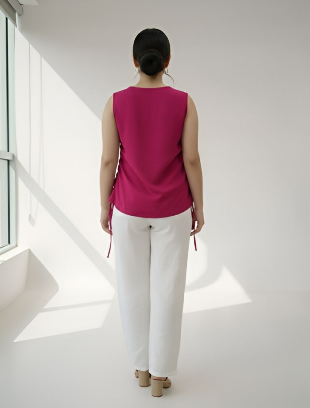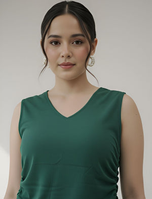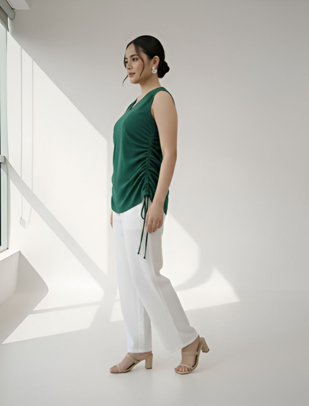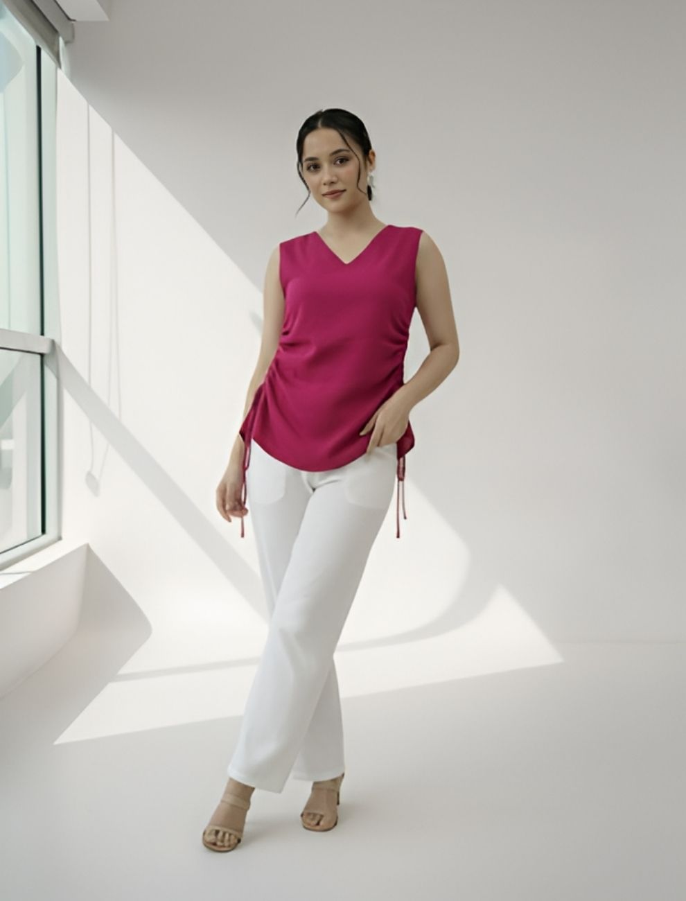 The V-neck design enhances the neckline gracefully, while the side drawstring detailing lets you adjust the shape to flatter your silhouette. The sleeveless cut adds a modern touch, ideal for warm days or layered styling. The vibrant teal blue hue reflects calm confidence — perfect for women who appreciate effortless sophistication.