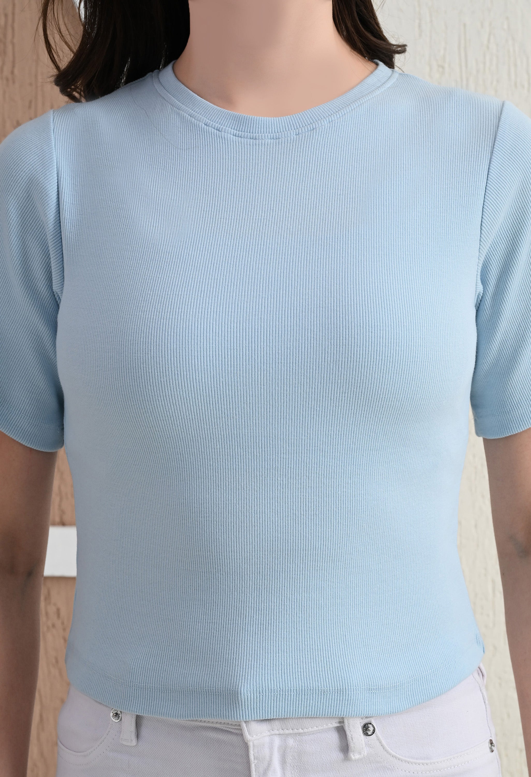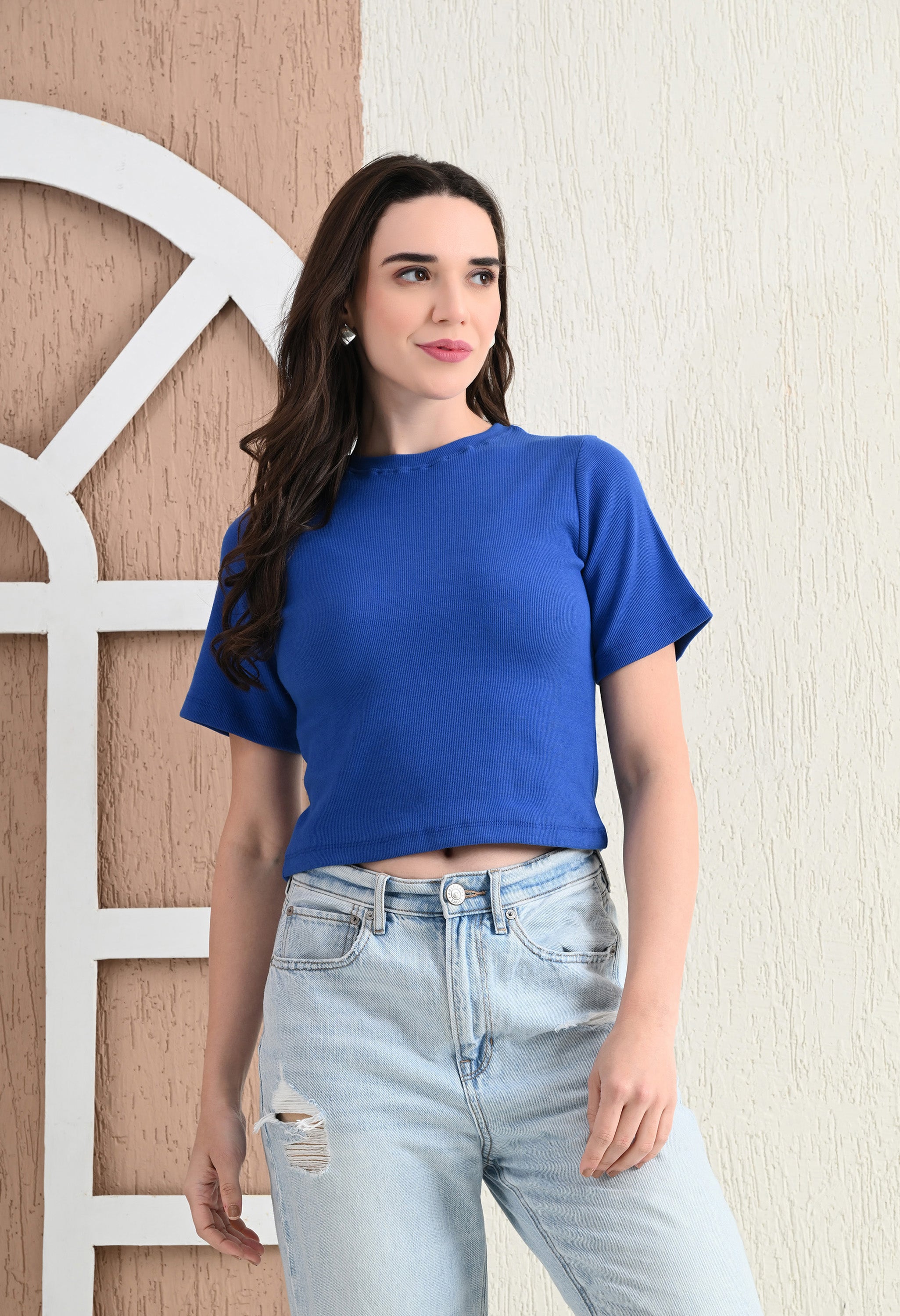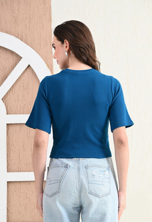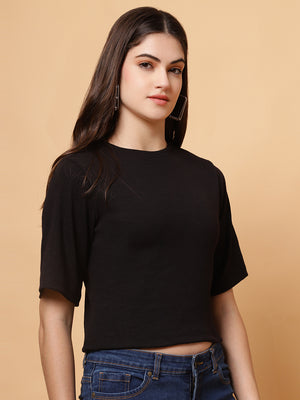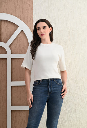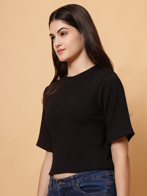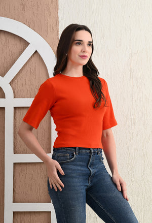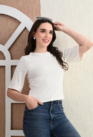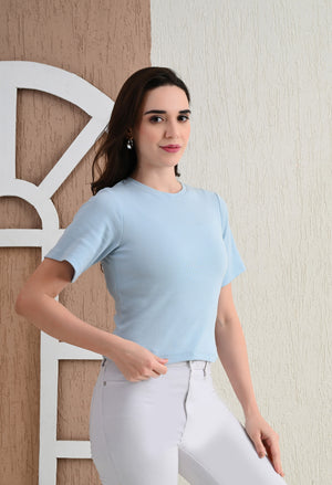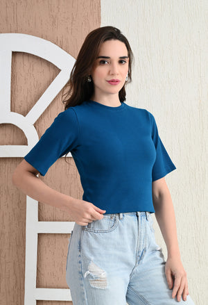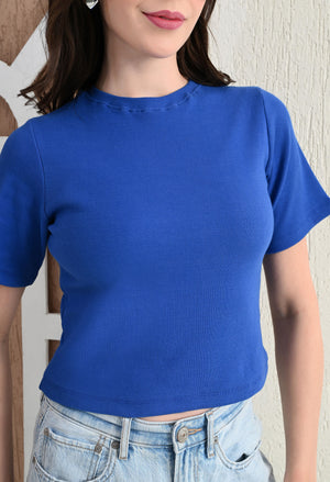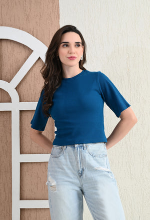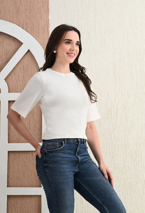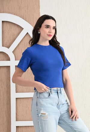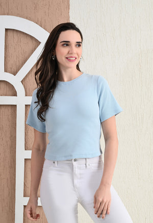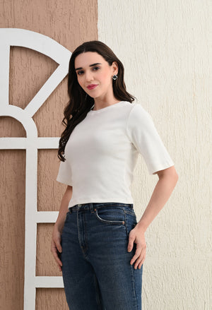 Design: Round-neck, half sleeves, cropped length