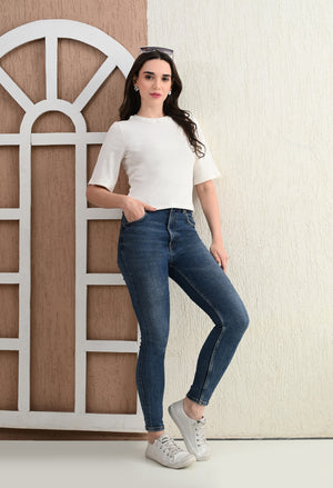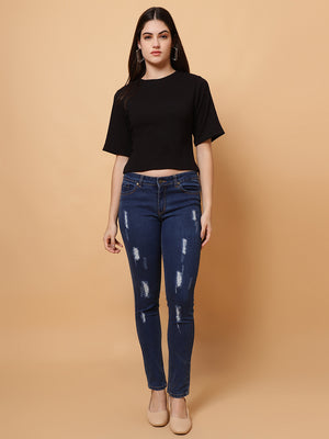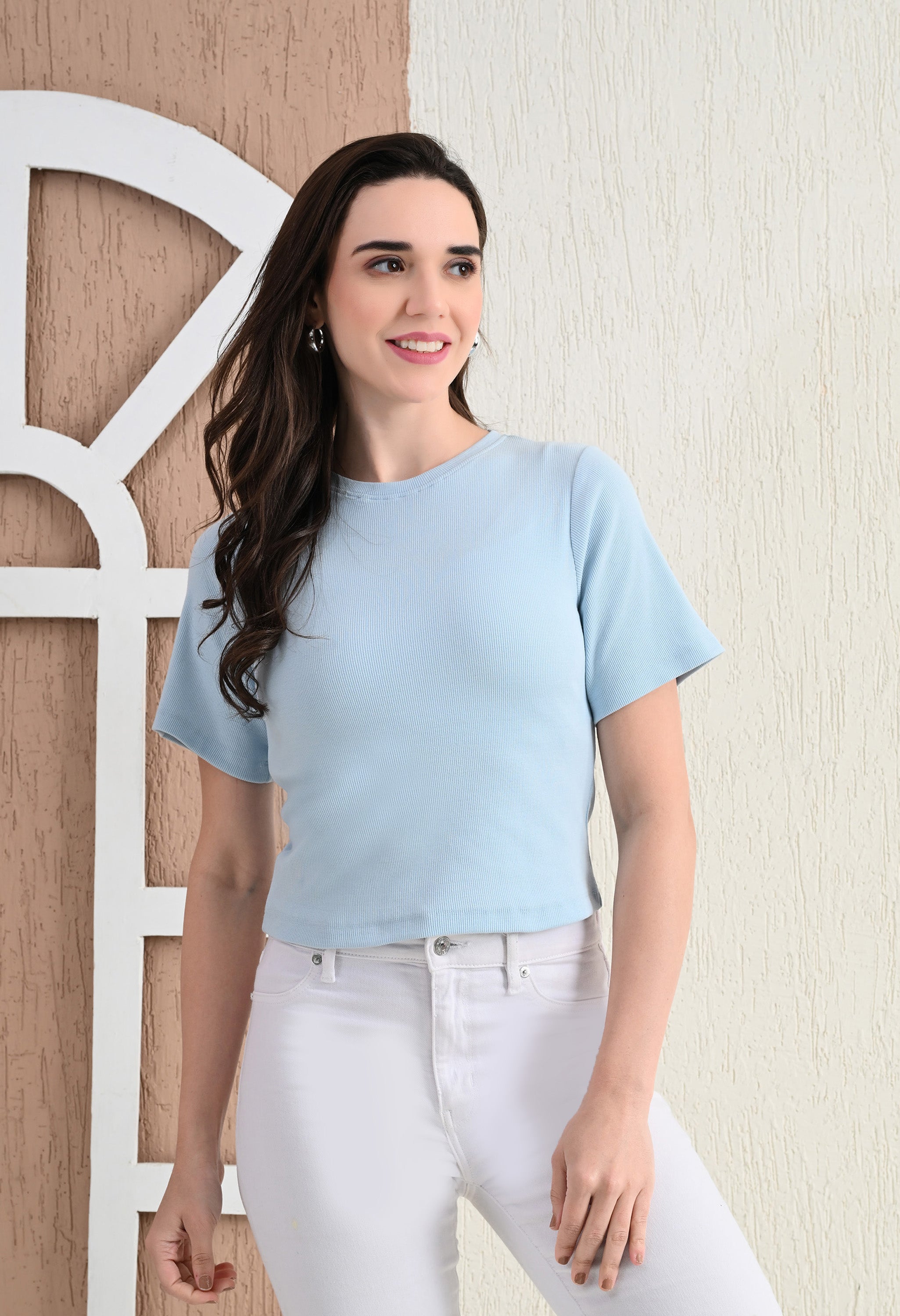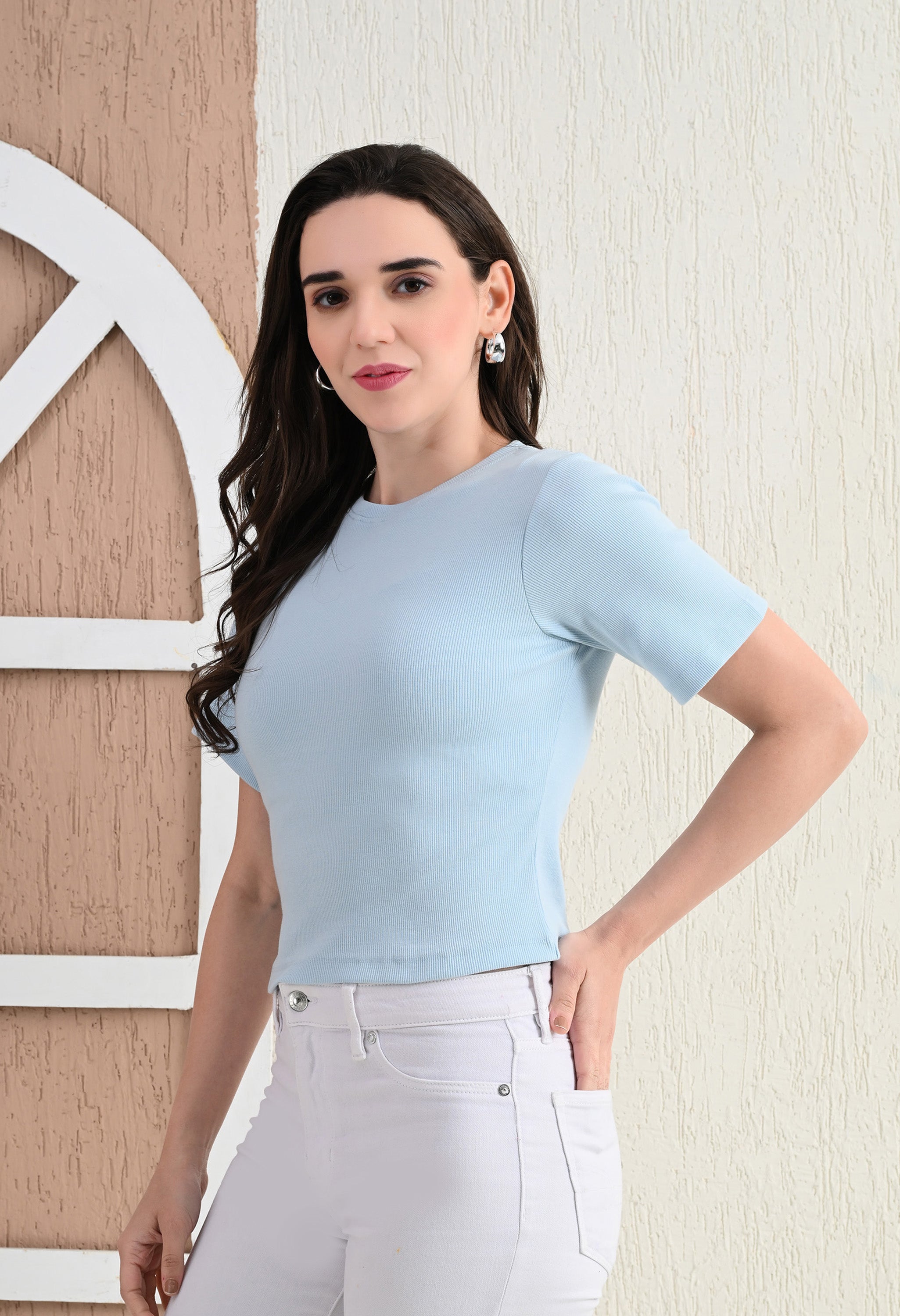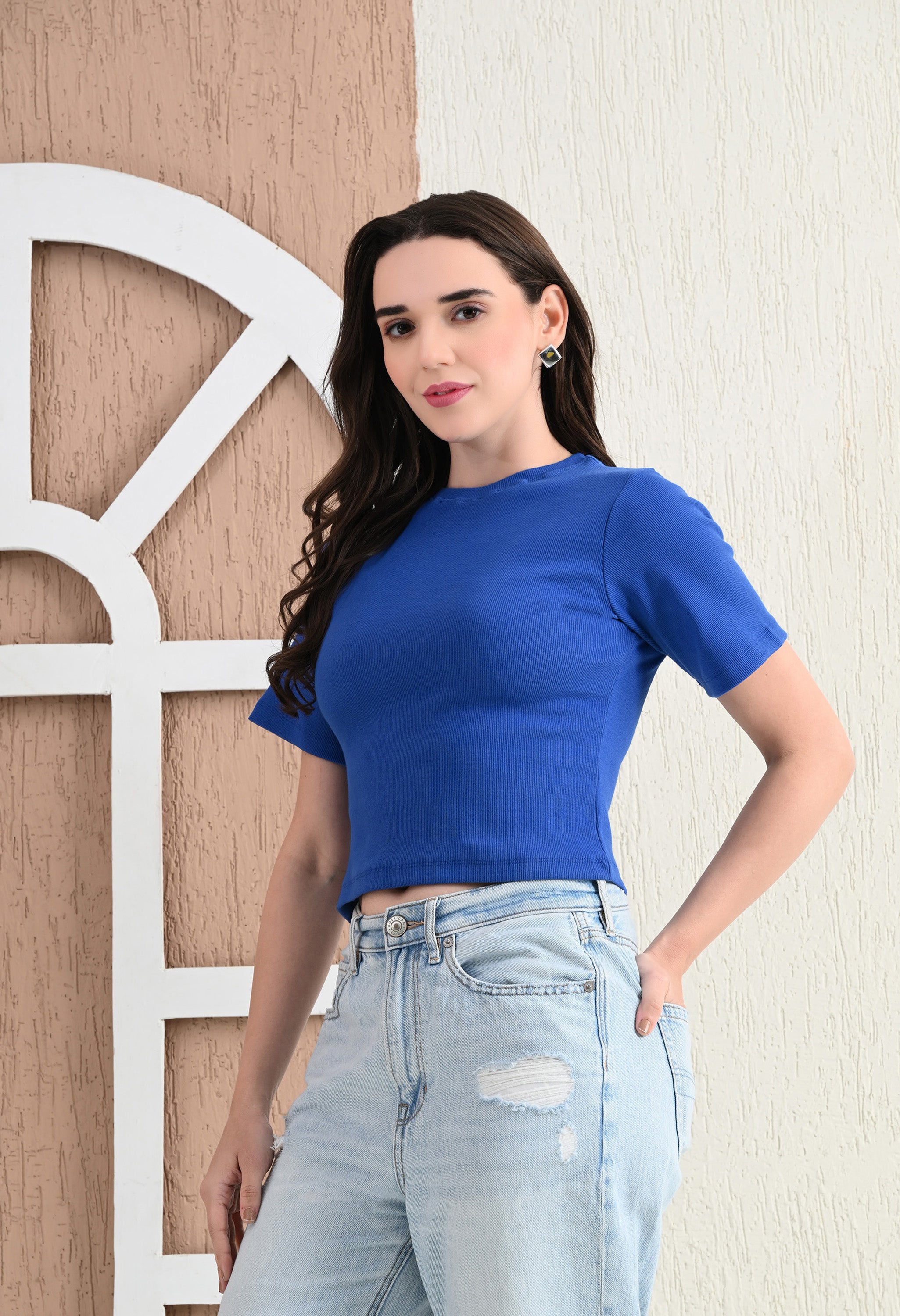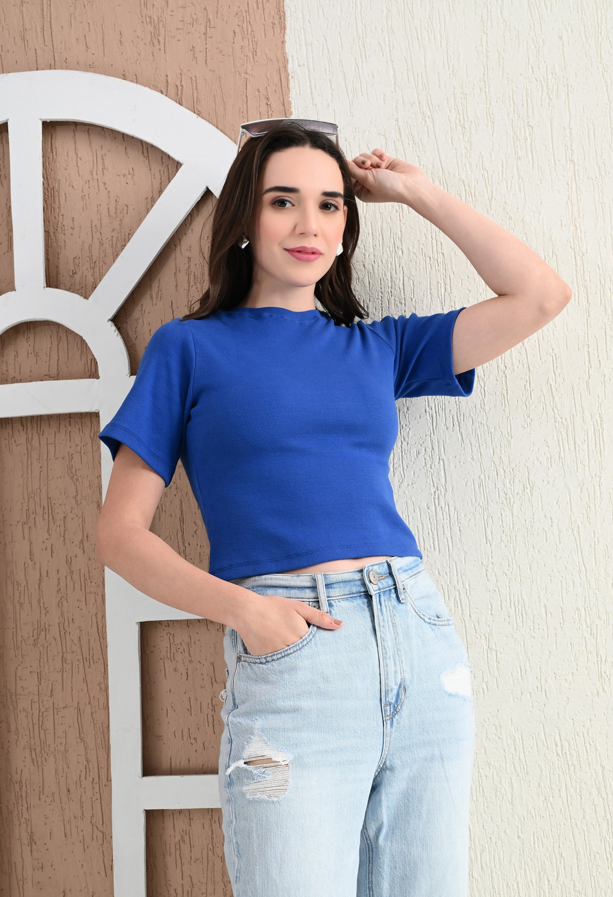 Design: Round-neck, half sleeves, cropped length