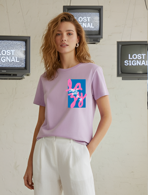 Crafted from premium single jersey cotton, this tee feels ultra-soft, breathable, and smooth against the skin — perfect for all-day comfort. The bold contrast typography graphic on the front adds a trendy, street-style edge, while the lilac hue keeps the vibe fresh and chic.