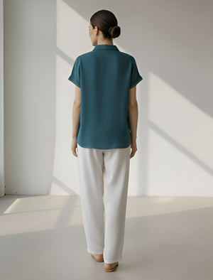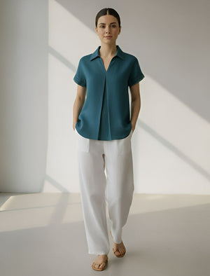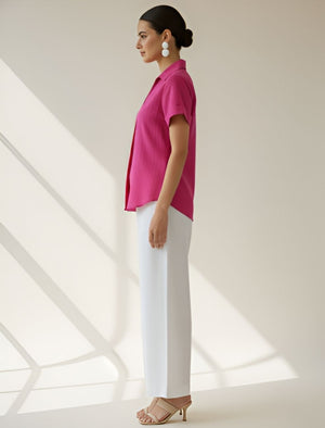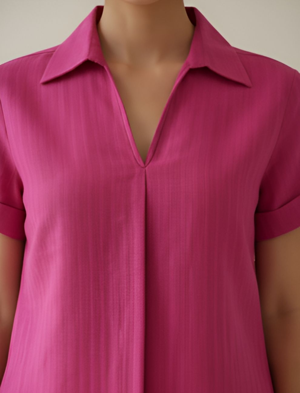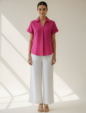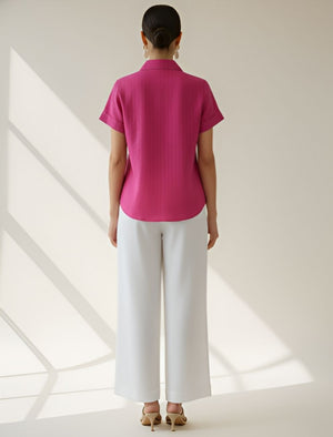 The collared neckline, short sleeves, and front pleat design add sophistication to its minimalist appeal. Its relaxed fit allows easy movement, making it ideal for office wear, brunches, or travel. The pink hue brings a refreshing pop of color to your wardrobe, balancing elegance and everyday wearability.